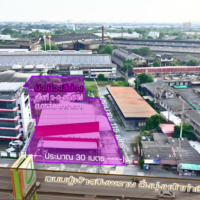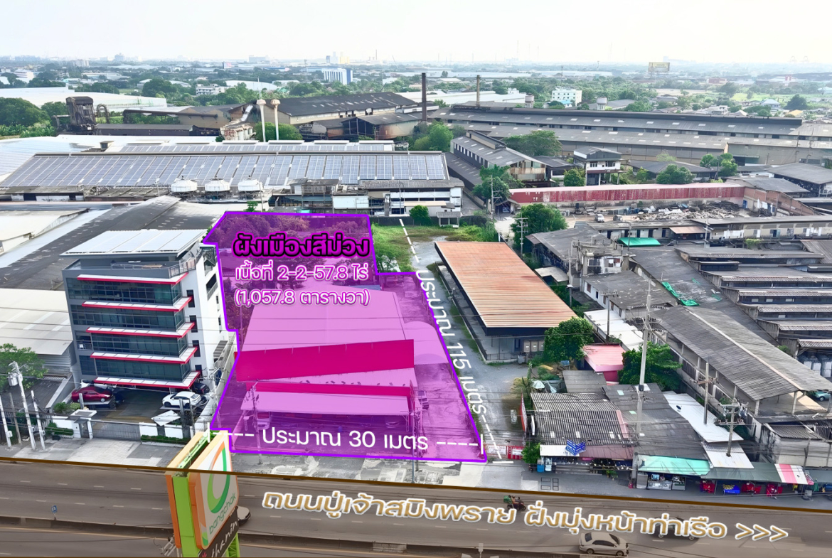 ขายที่ดินปู่เจ้าสมิงพราย 2-2-57.8ไร่ ผังสีม่วง ติดถนนใหญ่ เหมาะสร้างโรงงาน ราคา 95ลบ. ถูกกว่าราคาประเมิน ทำเลดี เดินทางสะดวก เหมาะสร้างโรงงาน/โกดัง